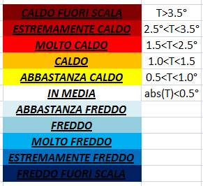 2) si vede il maggior numero di mesi caldi rispetto a quelli freddi, indice appunto di un riscaldamento LOCALE (diverso da globale, ribadisco): non c’è neanche un mese “FREDDO FUORI SCALA” e uno solo “ESTREMAMENTE FREDDO” (il febbraio del famoso Nevone), mentre ci sono ben due “CALDO FUORI SCALA” e 8 “ESTREMAMENTE CALDO”, per giunta concentrati nel 2011-2-4. Come dicevo poc’anzi, il 2010 è l’unico anno non caldo e il 2013 non caldissimo, gli altri 3 sono un “fiorire” di mesi decisamente caldi.