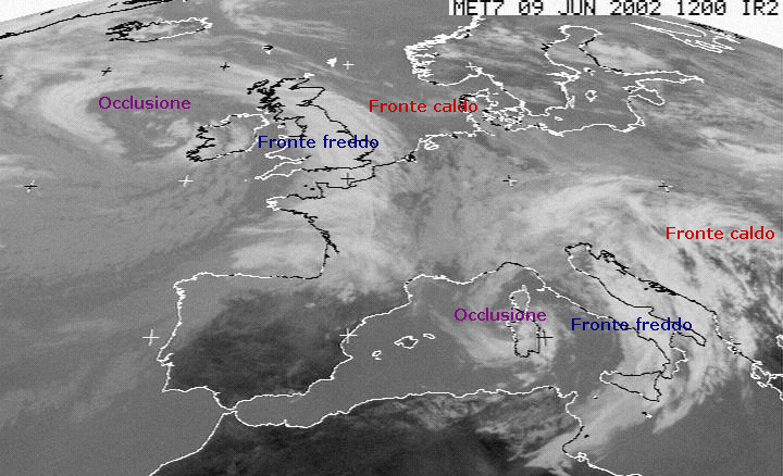 I sistemi extratropicali, invece, hanno una stretta regione nera chiamata “fessura secca”, a forma di spirale, nel centro della zona di bassa pressione. Questa intrusione di aria secca e fredda si verifica all’interno di aria umida e calda nella zona Est e Sud del sistema. La differenza di temperatura tra le diverse masse d’aria intensifica la tempesta generando i fronti.