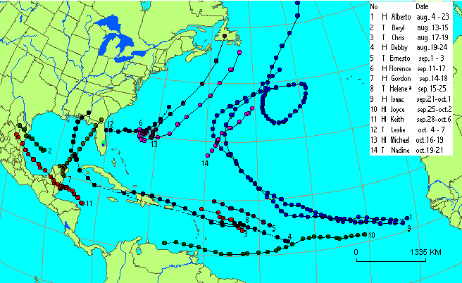 Traiettoria delle tempeste tropicali e degli uragani nella stagione degli uragani dell’anno 2000, |