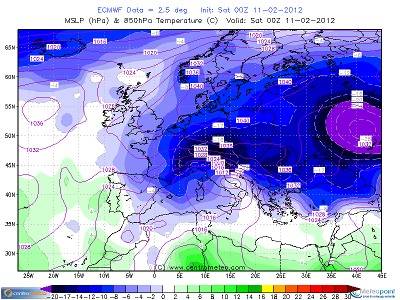 Mappa di analisi ore 00UTC dell'11 Febbraio 2012. Si notano le masse d'aria gelida a 850hPa (colori) e il ciclone al suolo (isobare). | Immagine satellitare (sat24.com) ore 00UTC dell'11 Febbraio 2012. Le nubi parlano da sole... |