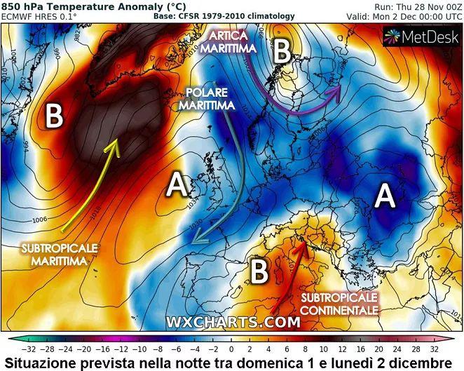 Guardando a medio termine, tuttavia, si prevede l’ingresso di una nuova saccatura che accompagnerà probabilmente una nuova perturbazione in transito sulla nostra penisola tra domenica 1 e lunedì 2 dicembre.