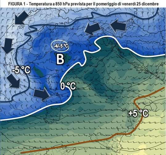 Nell’ultima analisi relativa all’evoluzione atmosferica attesa tra il venerdì 25 e sabato 26 dicembre possiamo finalmente caratterizzare meglio l’irruzione di aria artica che avrà il merito di portare una fase invernale sulla nostra penisola proprio in questi due giorni di festa. Nelle valutazioni che abbiamo esposto nei giorni scorsi ci siamo limitati solo a parlare di aria fredda in arrivo senza definire ulteriormente l’evento perché la complessità dell’evoluzione non poteva ancora permetterci di arrivare a definire questi dettagli.