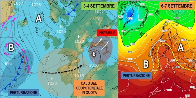 L’indebolimento del campo di alta pressione sulle Isole Britanniche, unito al suo temporaneo e parziale allungamento verso le alte latitudini, abbasserà il campo di geopotenziale sull’Europa sud-occidentale quanto basterà per impostare a queste latitudini un flusso umido, diretto tra il 3 e il 4 settembre prima verso la Sardegna e in seguito verso le regioni centro-meridionali. Non si tratterà di una perturbazione ma di uno stato instabile dell’atmosfera che creerà i presupposti per attivare moti verticali ascendenti, favorevoli alla formazione di rovesci e temporali, in spostamento dalla penisola iberica verso est proprio grazie a una timida e temporanea apertura della porta atlantica indotta dal calo del geopotenziale di cui sopra.