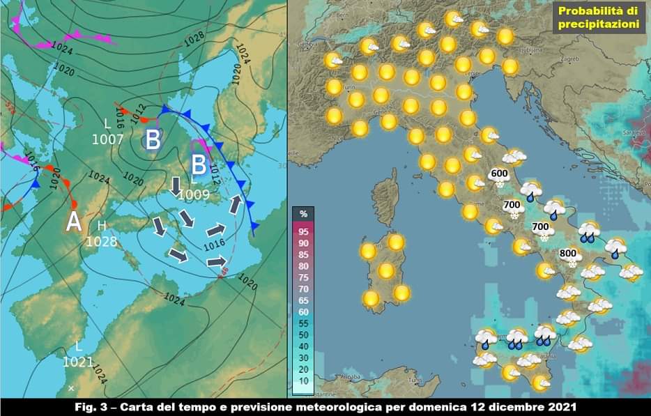 IL TEMPO DI SABATO 11 DICEMBRE – Come si può osservare dalla carta del tempo (fig. 1, a sinistra), le regioni centro-meridionali e le due Isole Maggiori saranno ancora interessate dall’ampia e ben strutturata figura di bassa pressione che a metà giornata porterà il proprio minimo sul Mar Tirreno meridionale, davanti alle coste campane, dove la modellistica numerica stima un valore di pressione intorno ai 993 hPa. La fitta rete di isobare generata dal vortice esporrà così la nostra penisola a un’intensa ventilazione in prevalenza settentrionale che andrà ad esaltare la fenomenologia sulle regioni che si troveranno sopravvento all’intenso flusso e che quindi vedranno uno stau molto attivo: in particolare, l’azione del sollevamento orografico accentuerà le precipitazioni su Marche, Abruzzo, Molise e il versante tirrenico di Calabria e Sicilia. Un altro aspetto significativo sarà il rinforzo del vento sulle Alpi centro-occidentali, dovuto all’aumento della pressione sul versante estero e all’attivazione di un discreto gradiente barico tra i due versanti che metterà in moto venti di föhn nelle valli alpine del Nord-Ovest. Detto questo, possiamo sintetizzare il tempo come segue (si veda la fig. 1, a destra).
