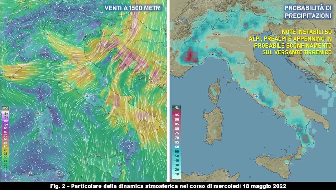 Il versante tirrenico, invece, quasi non si accorgerà dello sbuffo più fresco da nord-est perché la compressione adiabatica a cui andrà incontro la massa d’aria scavalcando l’Appennino porterà la temperatura ad aumentare: su questo settore, si passerà grosso modo dai 26-29 °C ai 29-32 °C. In secondo luogo, questo ingresso di aria più fresca proverà a rendere un po’ più instabile l’atmosfera durante le ore più calde, quando sarà un po’ più elevata sui rilievi la probabilità di assistere alla formazione di qualche rovescio anche temporalesco che, pilotato dal flusso in quota, nella giornata di mercoledì potrebbe localmente sconfinare sul versante tirrenico (fig. 2, a destra).