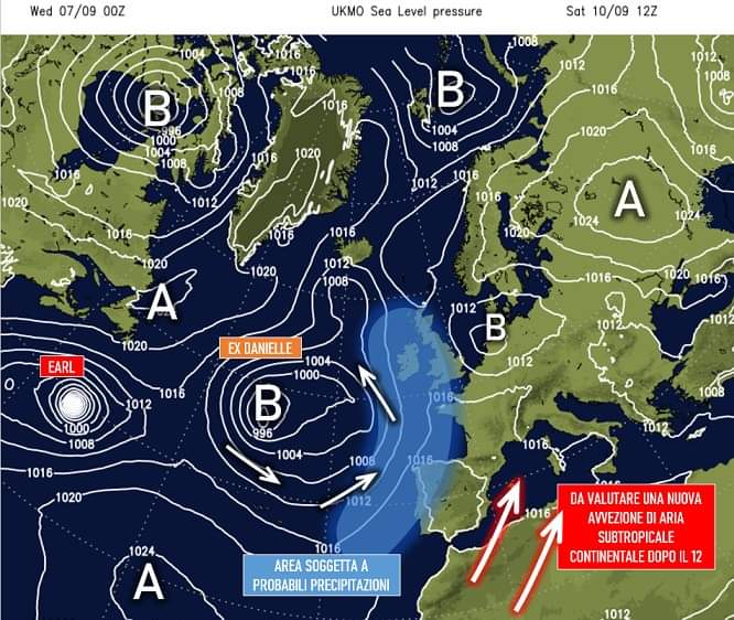 Le avvezioni di aria calda subtropicale continentale, cioè proveniente dal deserto del Sahara, potrebbero quindi non essere ancora finite: dopo quella che attualmente sta interessando in modo particolare il Sud e le due Isole Maggiori, un’altra potrebbe farsi strada dopo il 12 settembre proprio a causa di questa depressione che tale è diventata dalla trasformazione di un uragano atlantico. Riusciremo a definire meglio lo scenario nei prossimi giorni, alla luce dei nuovi aggiornamenti, quando coglieremo l’occasione anche per capire che cosa succederà all’uragano Earl.