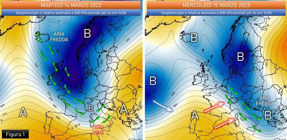 Nel corso della settimana che sta per iniziare vedremo in azione la stagione primaverile nelle vesti che dovrebbe indossare proprio quando l’inverno si appresta a congedarsi almeno sul calendario, perché dobbiamo dire che nella realtà anche quest’anno il trimestre freddo ha portato a casa ben pochi risultati. Osserveremo quindi un tipo di tempo molto vivace che alternerà giornate stabili ad altre instabili nelle quali, con l’arrivo di correnti più fredde, si verificherà anche un calo delle temperature e della quota nelle nevicate in montagna. Queste condizioni meteorologiche interesseranno la nostra penisola proprio tra martedì 14 e mercoledì 15 marzo, quando assisteremo al passaggio di una saccatura alimentata da aria artico-marittima che evolverà velocemente da nord-ovest verso sud-est, fino a raggiungere Grecia e Turchia nei giorni successivi e qui trasformarsi in goccia fredda (fig. 1).