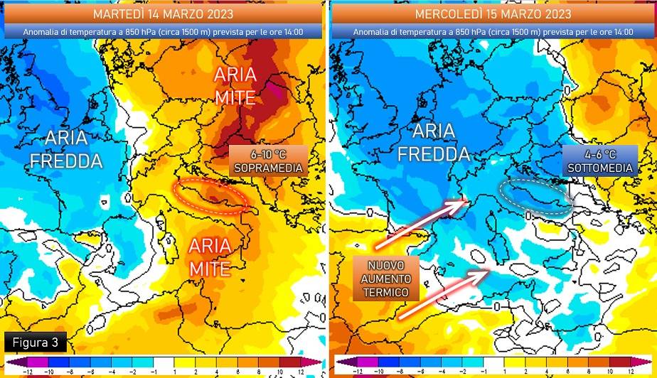 Con lo spostamento della perturbazione verso levante, mercoledì 15 il tempo instabile interesserà il Centro-Sud con prevalenti rovesci anche di tipo temporalesco e nevicate in Appennino a quote gradualmente più basse, fino a sfiorare anche quote di alta collina a fine evento (6-700 metri). Le precipitazioni non saranno persistenti e di conseguenza le cumulate non raggiungeranno livelli significativi, ad eccezione della Calabria tirrenica e della costa centro-orientale della Sicilia settentrionale dove sarà probabile avere piogge un po’ più organizzate dallo sbarramento orografico. L’avvicendamento tra masse d’aria diverse, una calda di richiamo nella fase di avvicinamento della saccatura e una più fredda a seguito del passaggio della perturbazione, causerà uno sbalzo termico anche marcato (fig. 3) che al livello del mare si farà maggiormente sentire laddove la rotazione del vento dai quadranti settentrionali non sarà mascherata dall’effetto favonico di caduta, come per esempio avverrà probabilmente nel corso di martedì sulla Pianura Padana centro-occidentale.