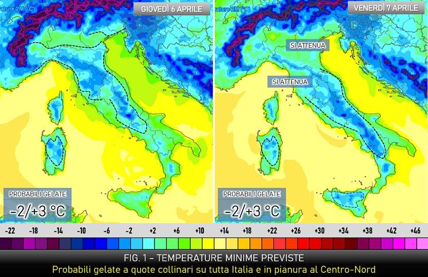 L’irruzione di aria artica è arrivata e ci interesserà ancora nelle prossime 48 ore con la sua fase più intensa, prima di iniziare a smorzarsi gradualmente pur mantenendo le temperature su valori inferiori alle medie climatologiche del periodo. Sarà proprio questo l’aspetto del tempo che sarà sotto i riflettori nei prossimi giorni perché, con l’attenuazione della ventilazione a partire da domani e con la serenità del cielo nelle notti su giovedì 6 e venerdì 7, diventeranno più elevate le probabilità di avere gelate fino a quote collinari su tutta la nostra penisola e probabilmente fino in pianura su molte aree delle nostre regioni centro-settentrionali (fig. 1): tra giovedì e venerdì i valori previsti all’alba oscilleranno per lo più tra -2 °C a +3 °C nelle aree delimitate dalla linea nera tratteggiata, ma non si esclude che localmente si possano registrare temperature minime ancora più basse, con picchi fino a -3/-4 °C in aperta campagna.
