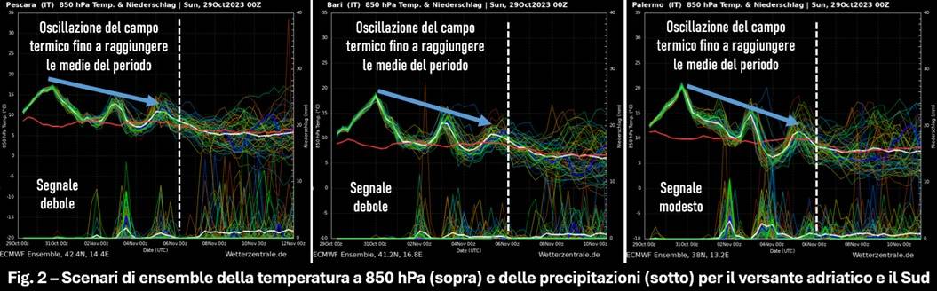 Sul Mediterraneo le conseguenze di questa evoluzione non saranno legate solo al transito del nuovo sistema perturbato, ma anche a un importante ricambio d’aria perché la vasta circolazione ciclonica avrebbe la forza per far affluire aria fredda di origine polare marittima fino alla nostra penisola (fig. 1, a destra). Nella seconda parte della settimana entrante ci aspettiamo quindi un significativo calo termico che sarà in grado di scrivere la parola fine alla lunga fase calda che ininterrottamente ci accompagna da inizio settembre. Non aspettiamoci l’arrivo del freddo, ma semplicemente un'oscillazione dei valori di temperatura attorno alle medie del periodo che, a questo punto, saranno quelle di inizio novembre e quindi saranno tipicamente autunnali.