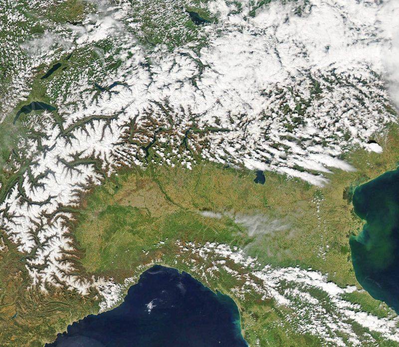Le Alpi: ancora ricoperte di neve (specie quelle occidentali), abbondante alle alte quote, lasciano però intravedere i versanti di color marrone a quote inferiori, in quanto qui il risveglio vegetativo è più lento rispetto alle pianure (solitamente rinverdiscono a maggio/giugno).