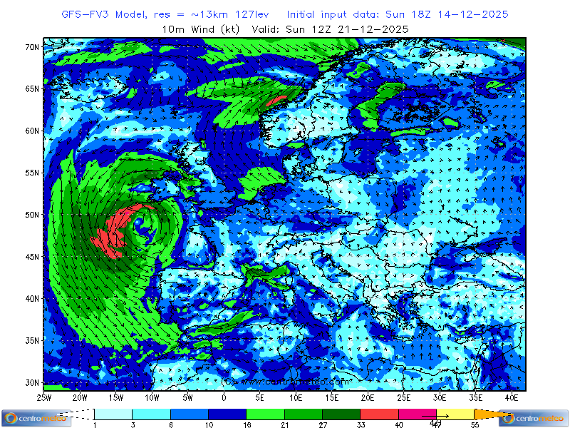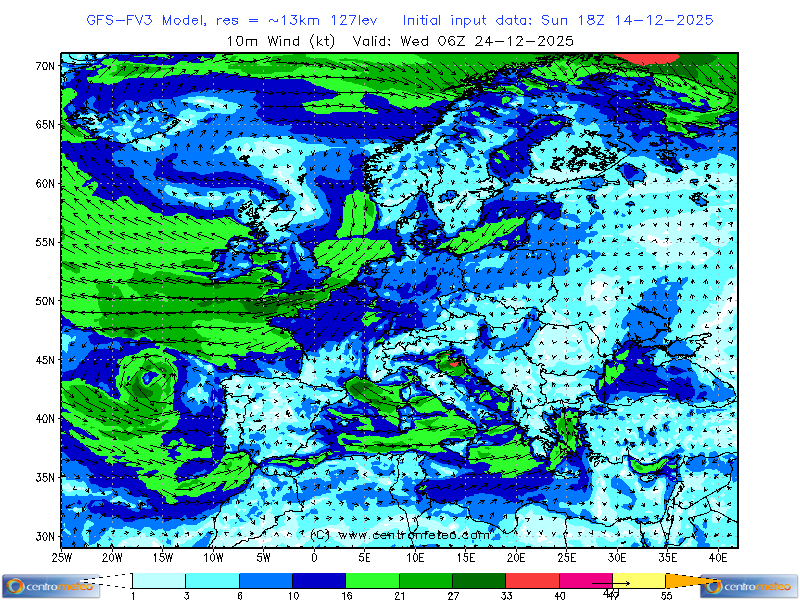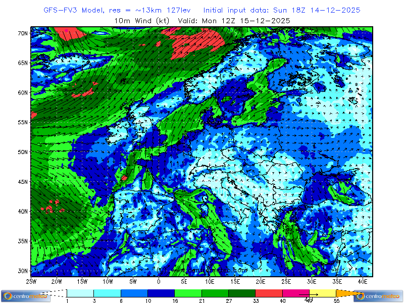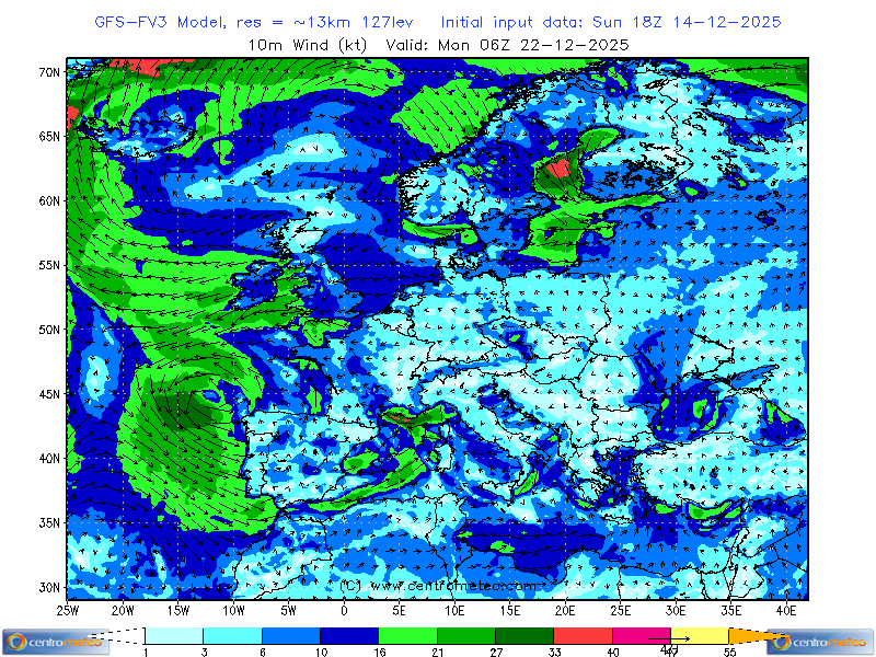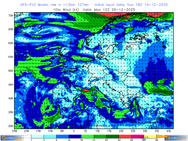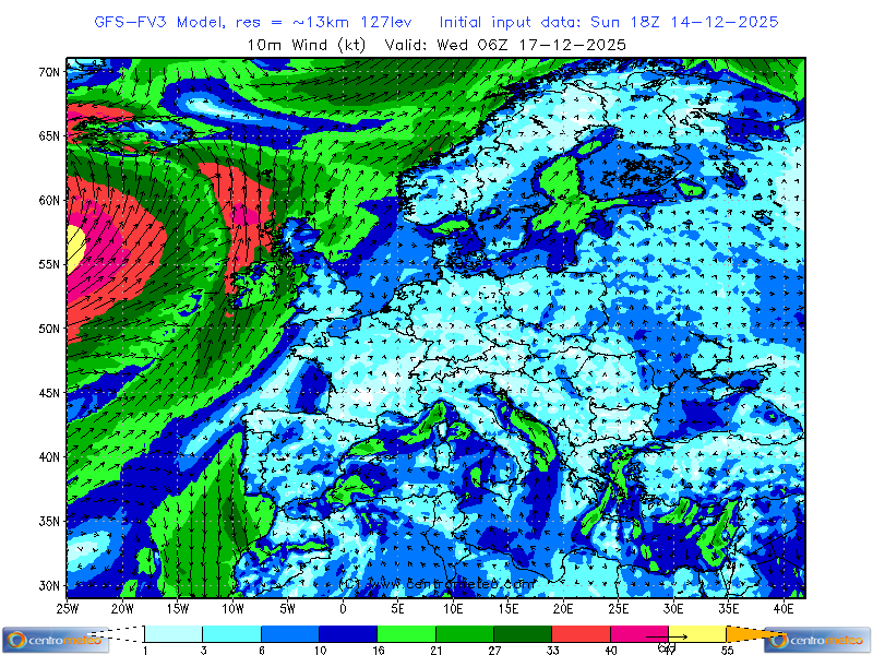 Mappa del modello del centro europeo di Reading ECMWF con i venti previsti a 850hPa. Zoom Italia.