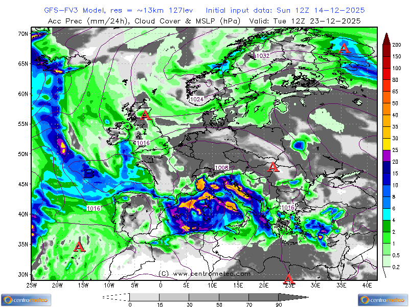Classica mappa del modello WRF-ARW-7km (su GFS) con pressione al suolo e accumulo delle... Leggi tutto...