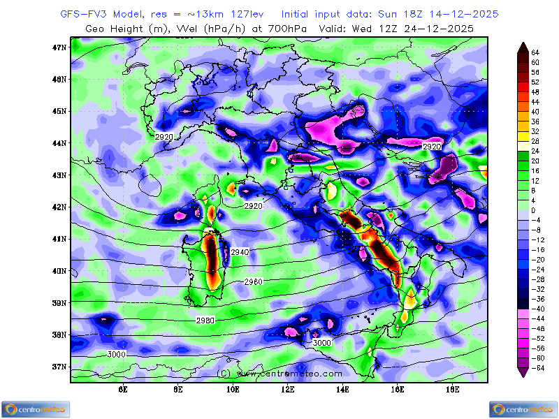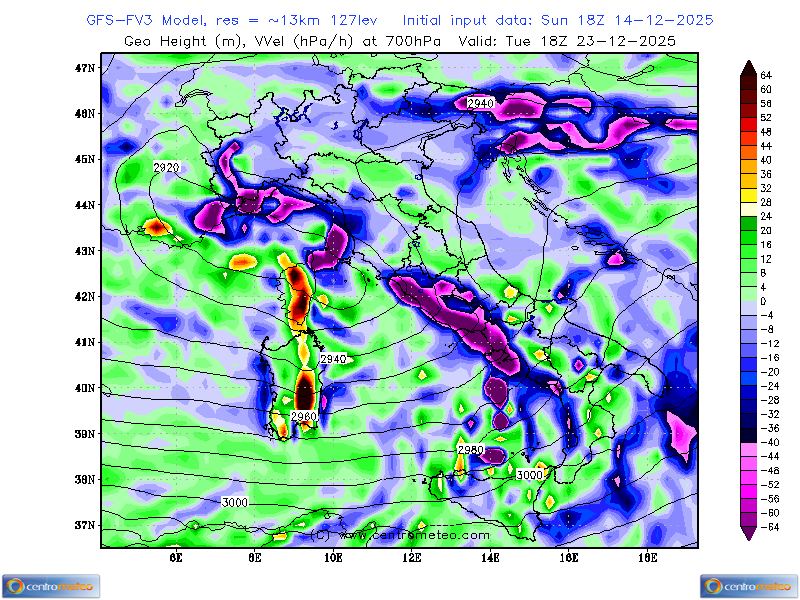 Mappa del modello del centro europeo di Reading ECMWF con geopotenziale e temperature a 850hPa. Zoom Italia.