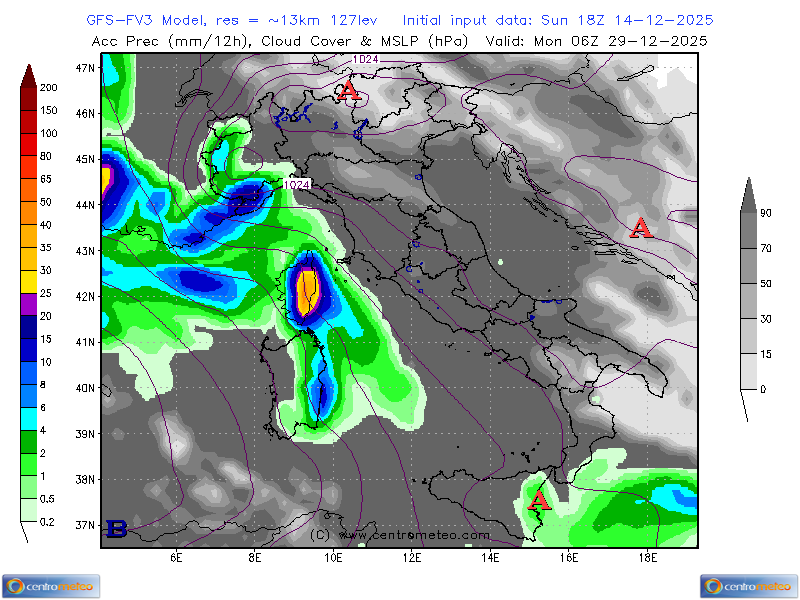 GFS MSLP 24h Prec, l'accumulo di precipitazioni previsto dal modello americano gfs nelle 24 ore... Leggi tutto...