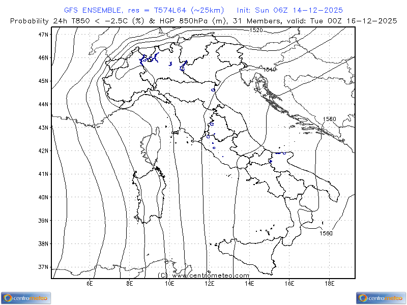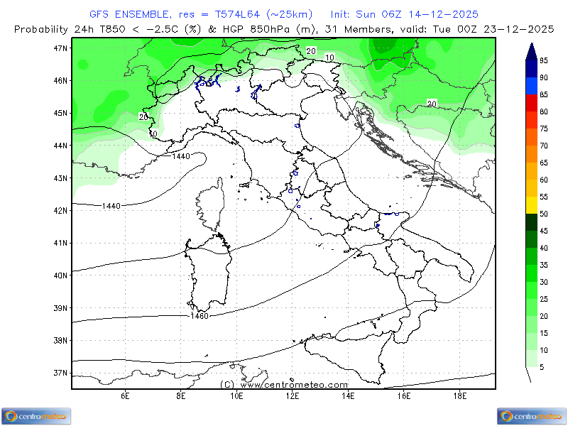 Probabilità che la temperatura a 850hPa sia maggiore di 15°C e l'altezza geopotenziale media a... Leggi tutto...