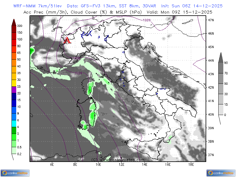 Mappa sull'Italia del modello non idrostatico ad alta risoluzione WRF NMM-8km, su dati GFS, con i... Leggi tutto...