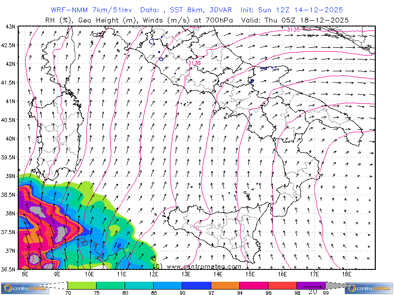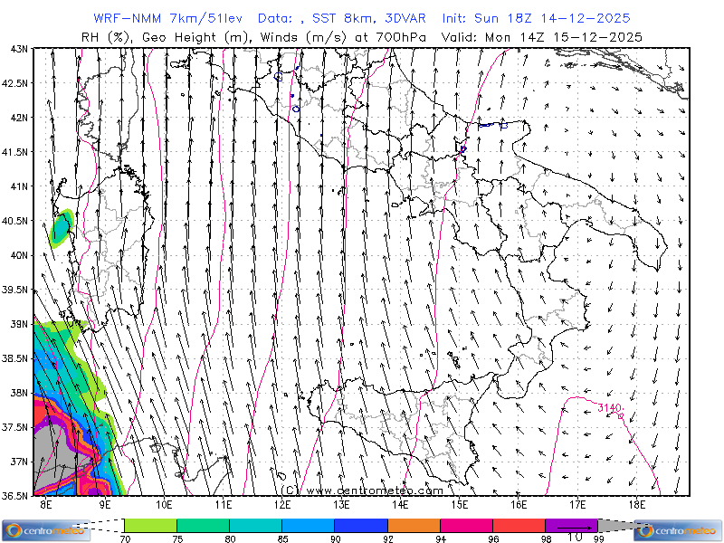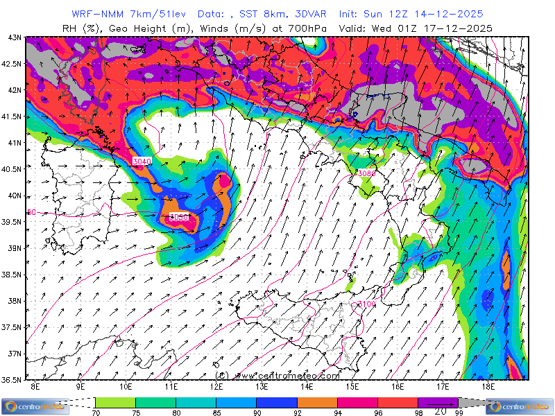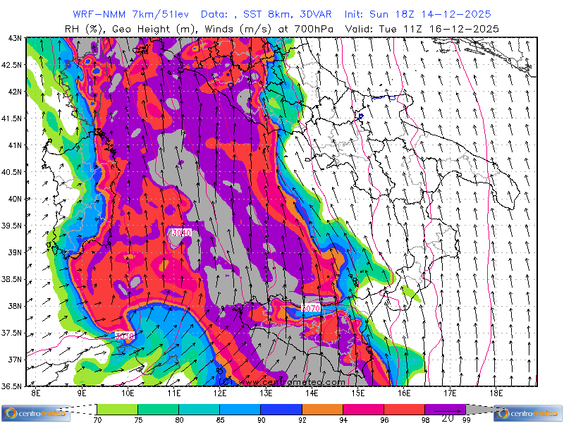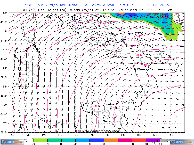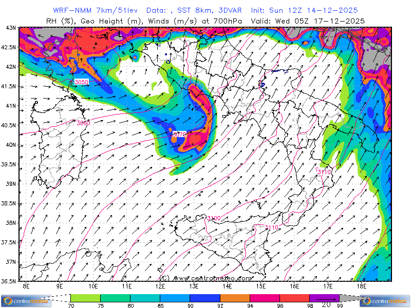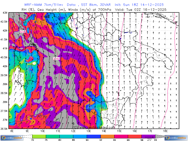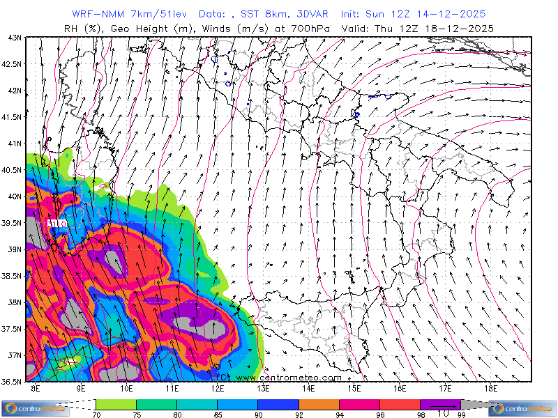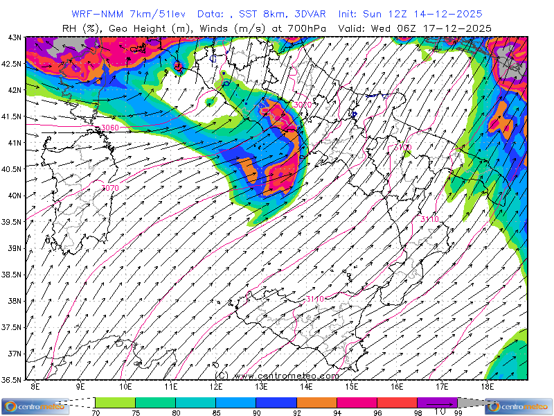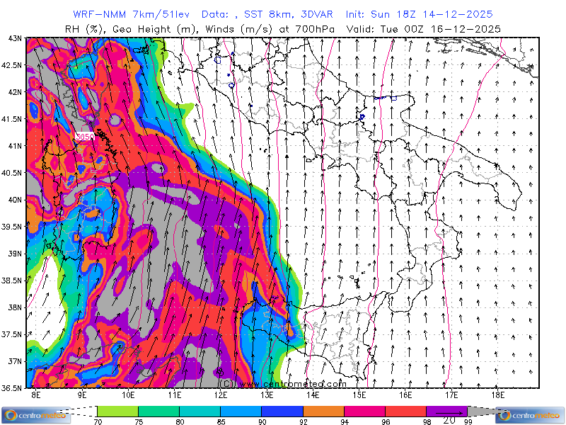 WRF ARW-7km su dati GFS: mappa sull'Italia del modello fisico-matematico con l'umidità relativa e... Leggi tutto...