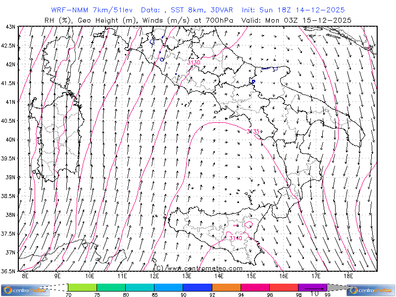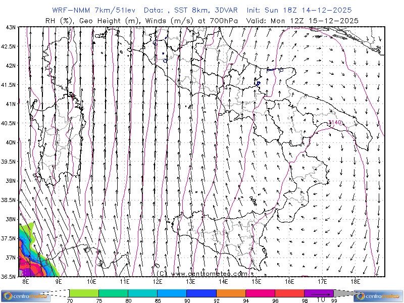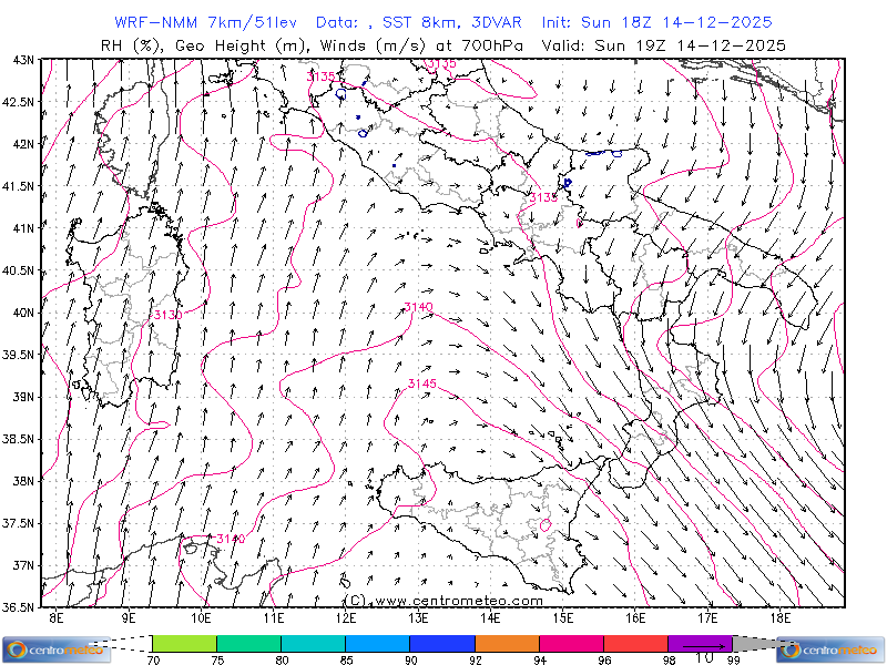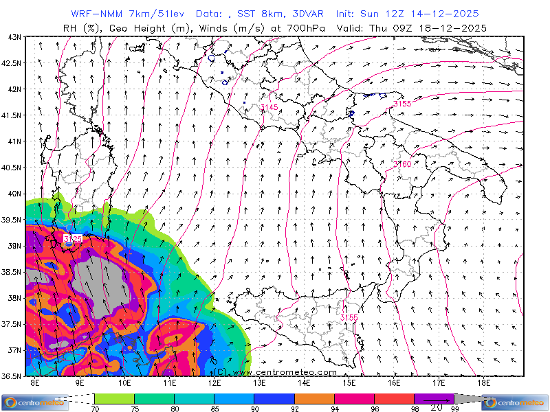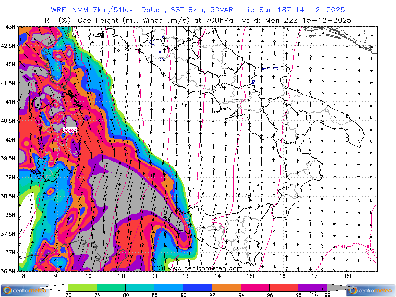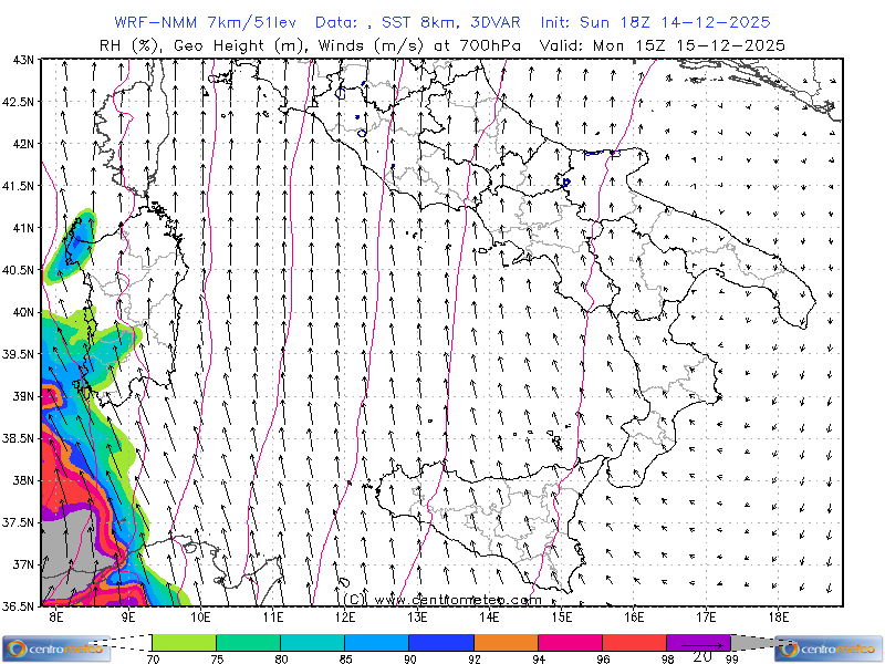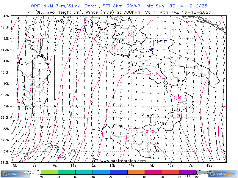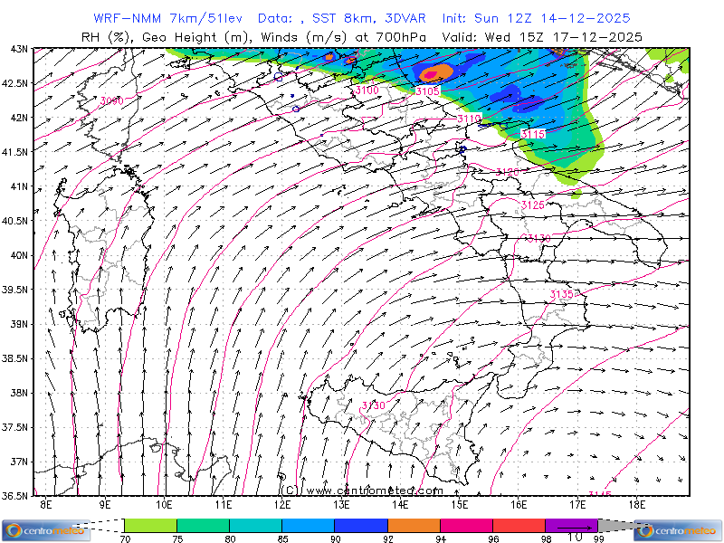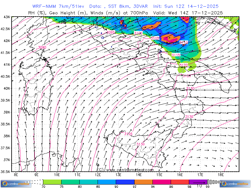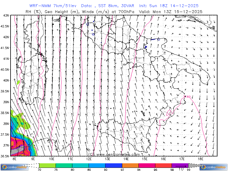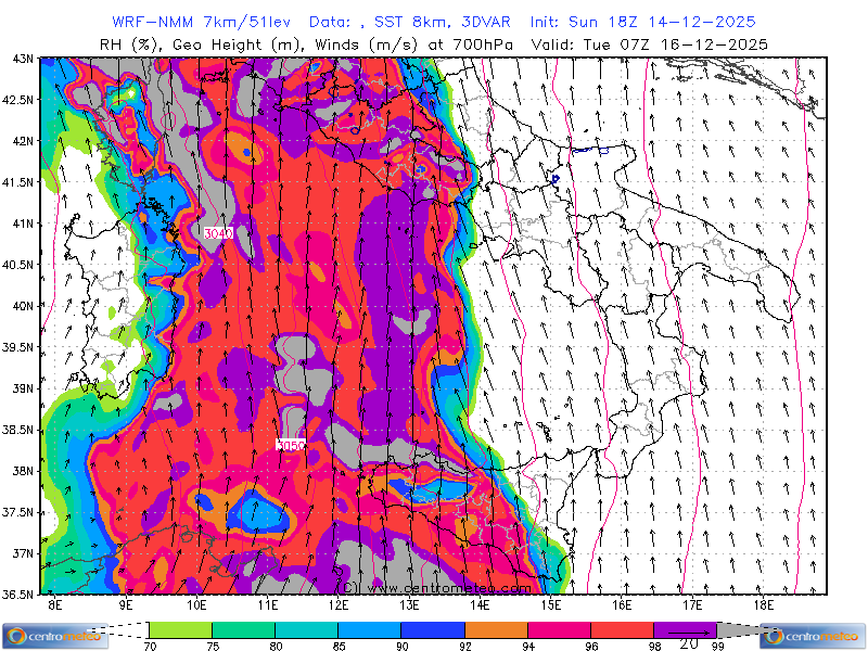 WRF ARW-7km su dati GFS: mappa sull'Italia del modello fisico-matematico con l'umidità relativa e... Leggi tutto...