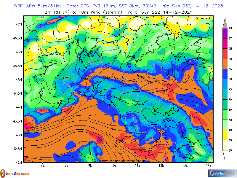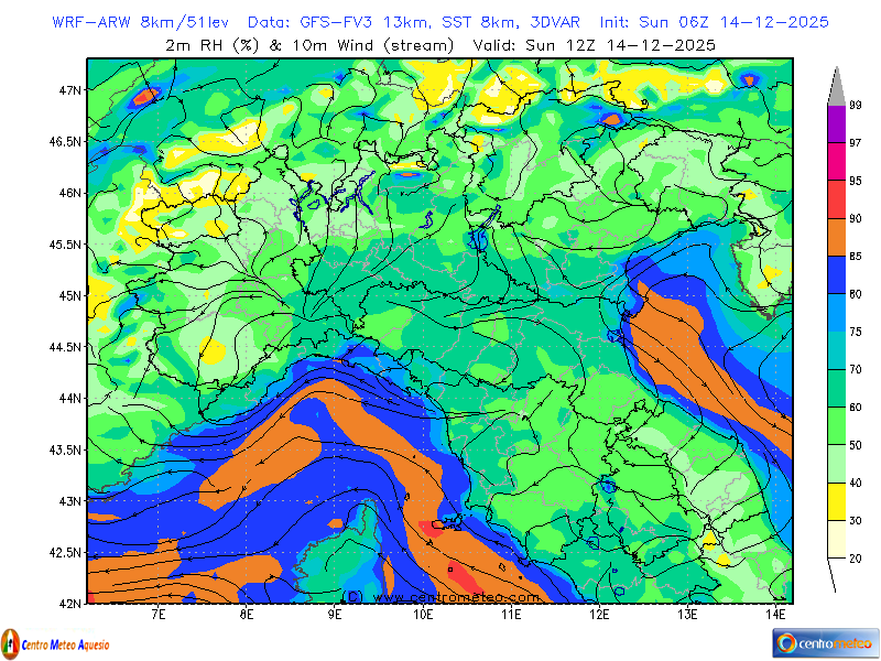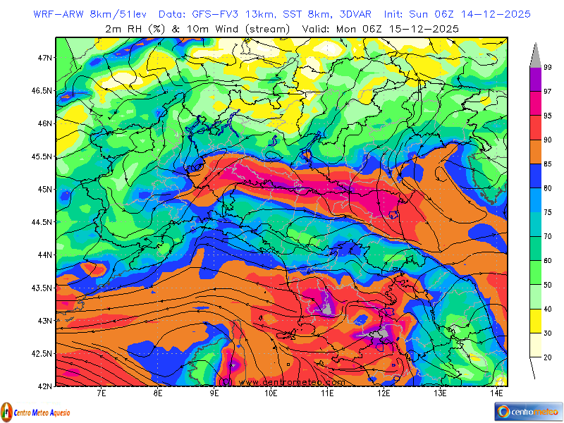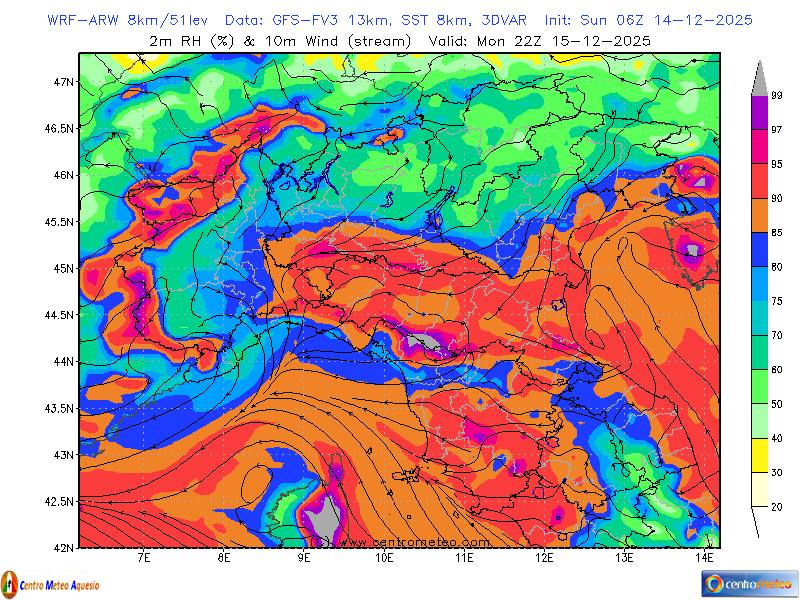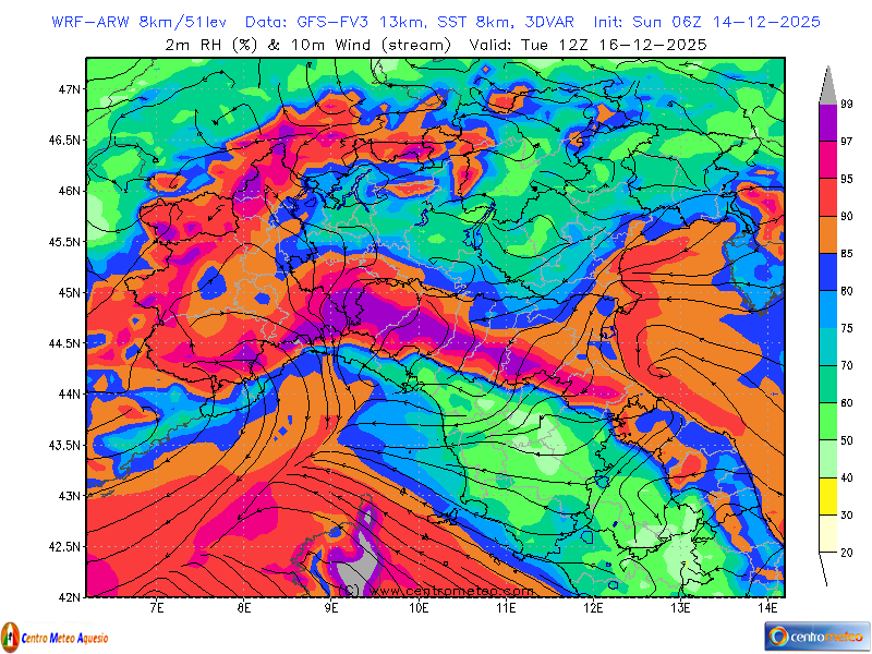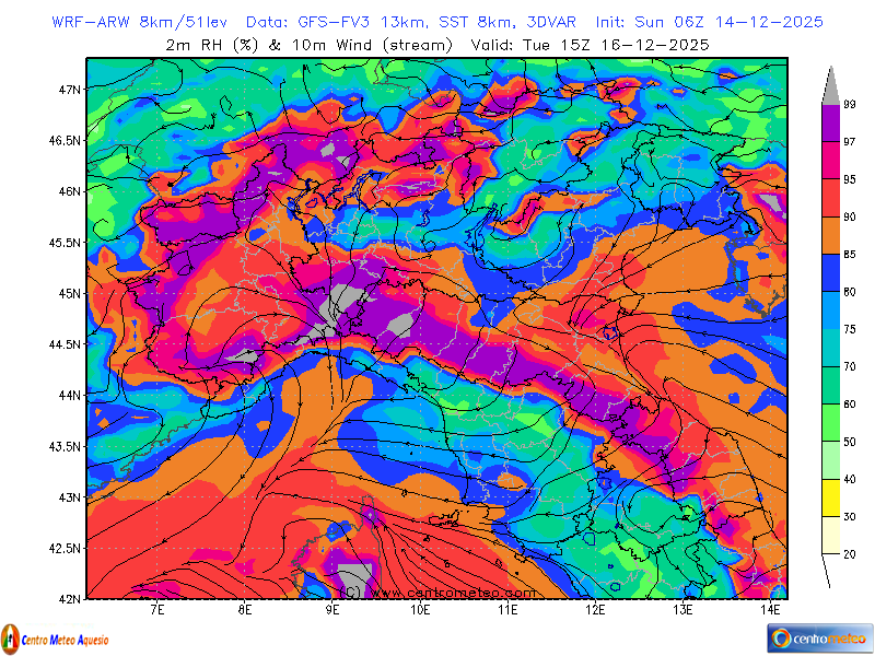 Stream line e temperatura 850hPa attesi dal modello ECMWF da Wetterzentrale,Italia