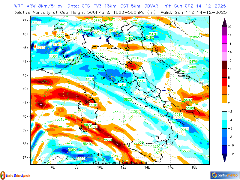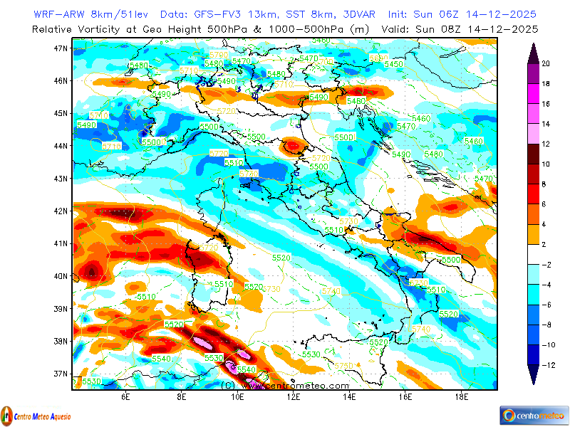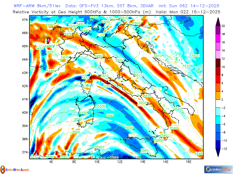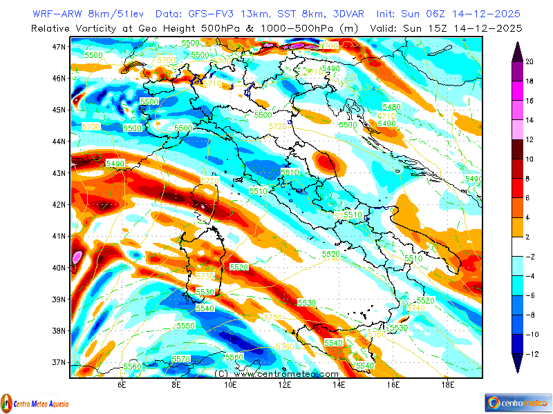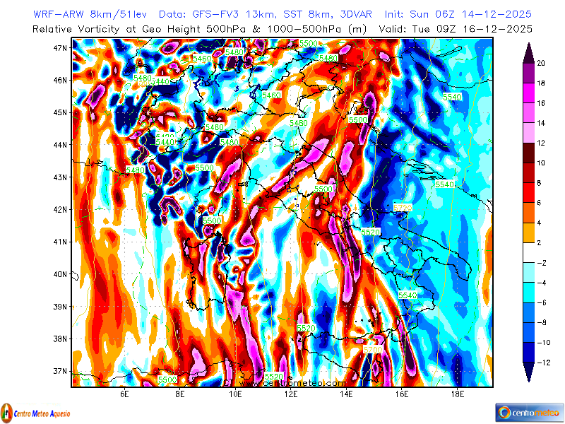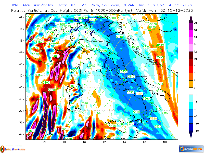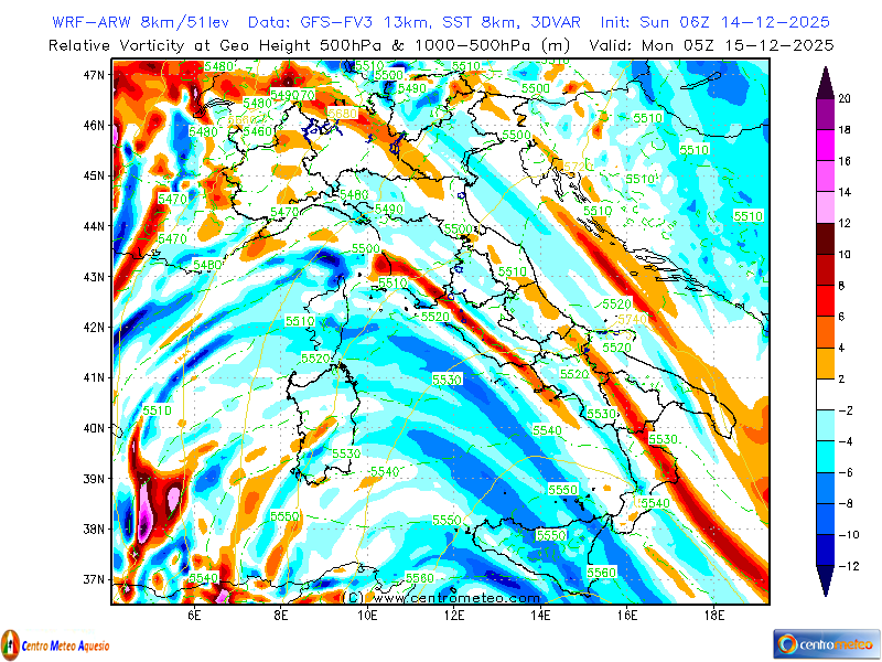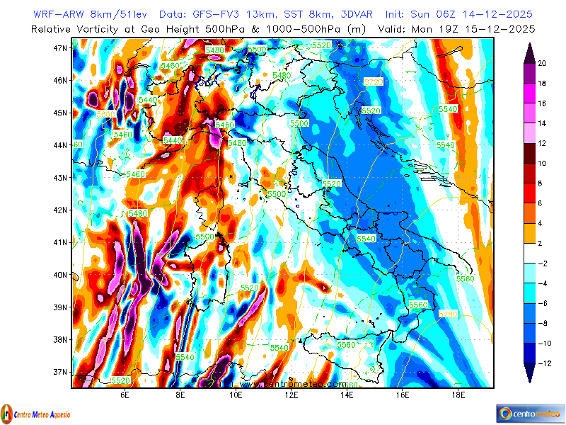 Spaghetti Ensemble del modello GFS (21 membri) con le isoipse al geopotenziale 500hPa.