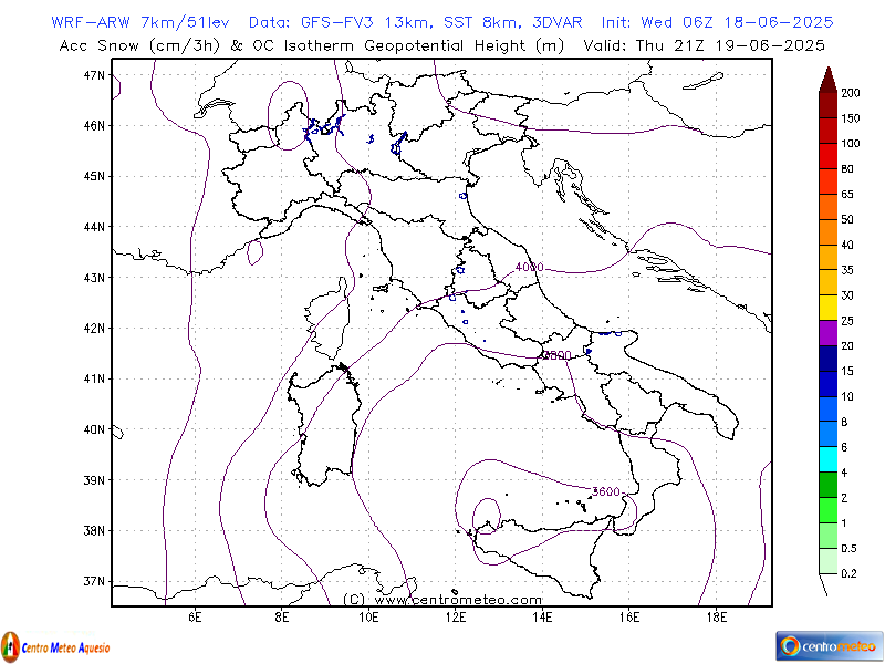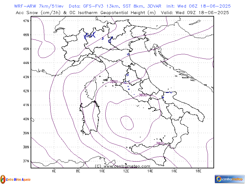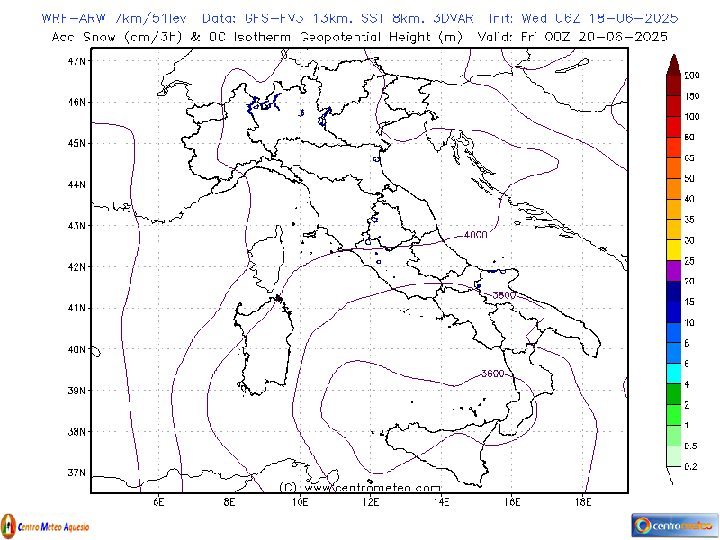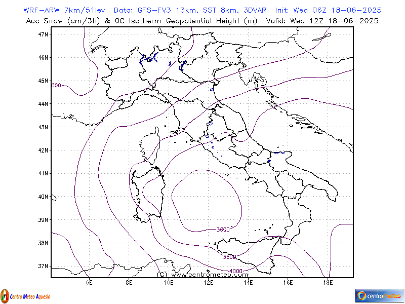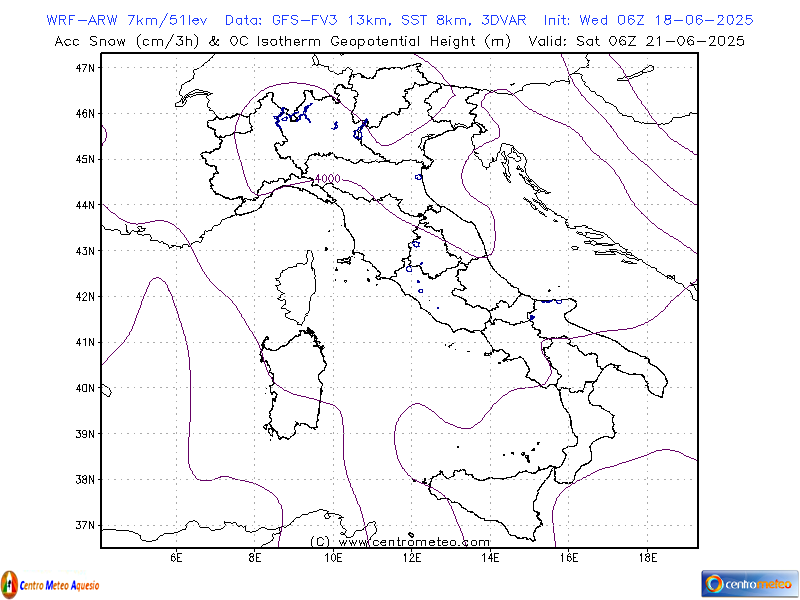 Mappa Centro-Nord Italia del modello WRF con altezza dello zero termico e l'accumulo di neve (in... Leggi tutto...