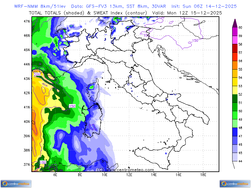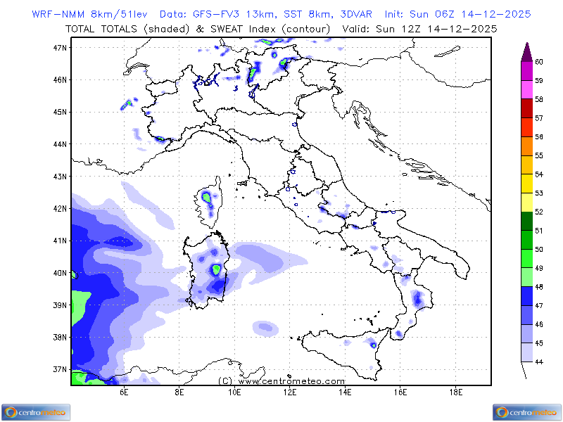 In questa mappa WRF-ARW per il Centro-Nord estrapoliamo, assieme alla dew point (temperatura di rugiada) anche la possibilità di nebbia.