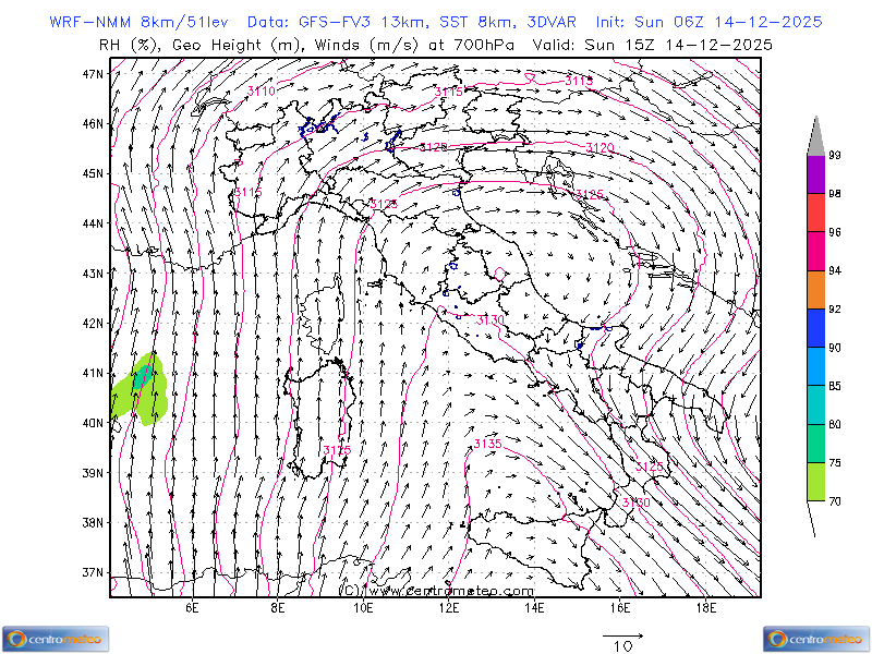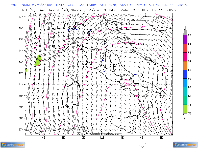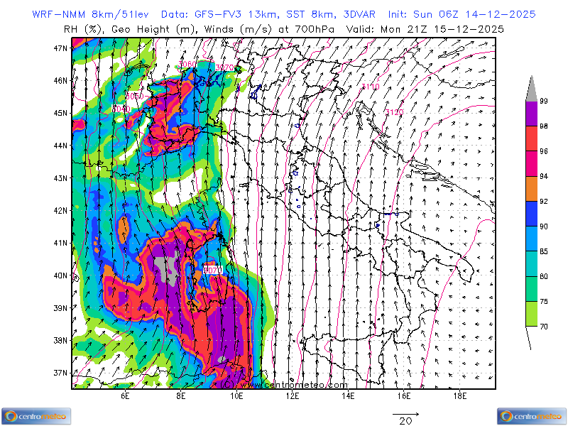 Mappa sull'Italia del modello WRF ARW (dati GFS) con la pressione al suolo (MSLP) e l'accumulo... Leggi tutto...