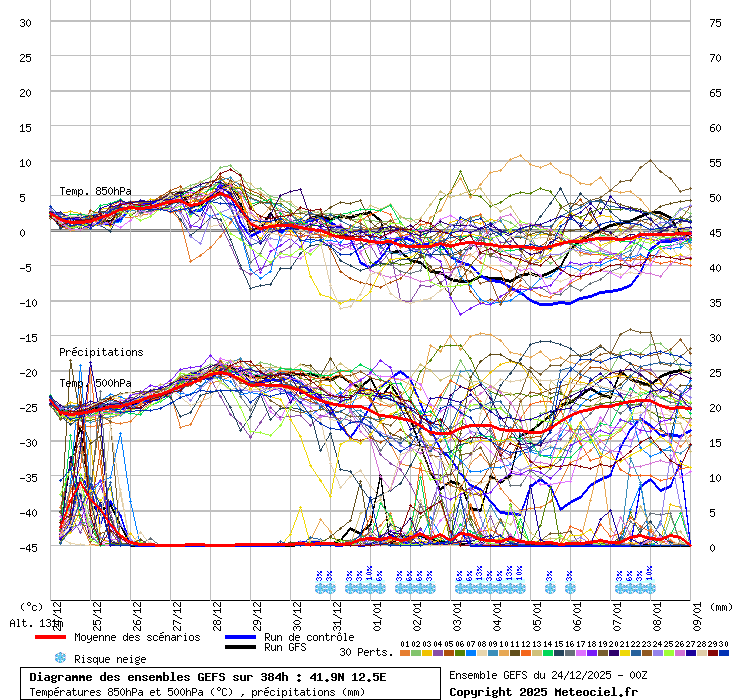 In queste mappe gli "spaghetti" generati dalla tecnica Ensemble per tutti i modelli matematici di cui si dispongono i dati, su località di vostra scelta. La tecnica Ensemble consiste nell'effettuare più corse (più quella di controllo) modificando di poco e opportunamente le condizioni iniziali inserite nei modelli stessi per verificare variazioni e affidabilità nell'evoluzione prevista. Laddove le soluzioni tendono ad "addensarsi" la prognosi sarà più probabile.
