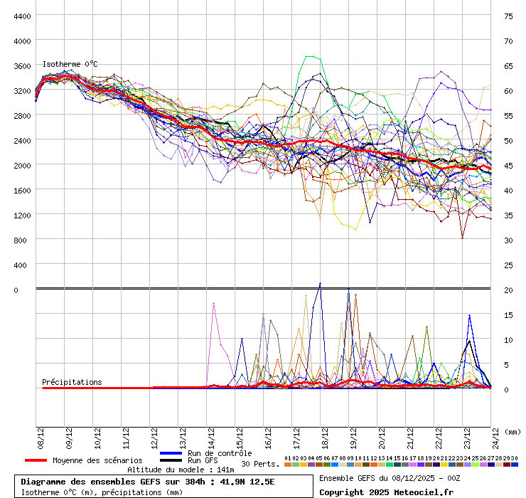 In queste mappe gli "spaghetti" generati dalla tecnica Ensemble per tutti i modelli matematici di cui si dispongono i dati, su località di vostra scelta. La tecnica Ensemble consiste nell'effettuare più corse (più quella di controllo) modificando di poco e opportunamente le condizioni iniziali inserite nei modelli stessi per verificare variazioni e affidabilità nell'evoluzione prevista. Laddove le soluzioni tendono ad "addensarsi" la prognosi sarà più probabile.