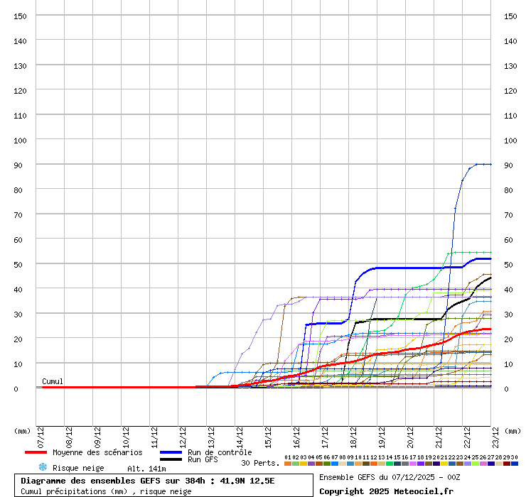In queste mappe gli "spaghetti" generati dalla tecnica Ensemble per tutti i modelli matematici di cui si dispongono i dati, su località di vostra scelta. La tecnica Ensemble consiste nell'effettuare più corse (più quella di controllo) modificando di poco e opportunamente le condizioni iniziali inserite nei modelli stessi per verificare variazioni e affidabilità nell'evoluzione prevista. Laddove le soluzioni tendono ad "addensarsi" la prognosi sarà più probabile.