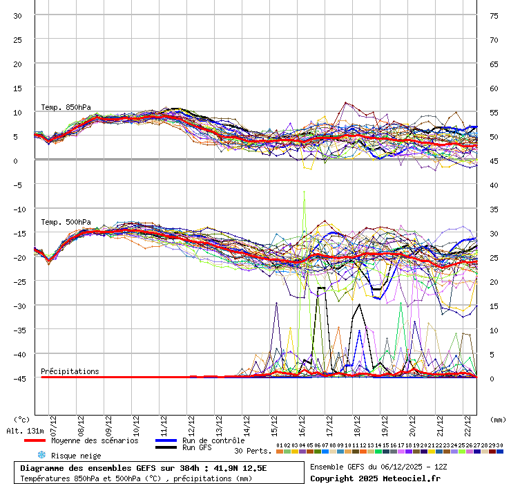 In queste mappe gli "spaghetti" generati dalla tecnica Ensemble per tutti i modelli matematici di cui si dispongono i dati, su località di vostra scelta. La tecnica Ensemble consiste nell'effettuare più corse (più quella di controllo) modificando di poco e opportunamente le condizioni iniziali inserite nei modelli stessi per verificare variazioni e affidabilità nell'evoluzione prevista. Laddove le soluzioni tendono ad "addensarsi" la prognosi sarà più probabile.