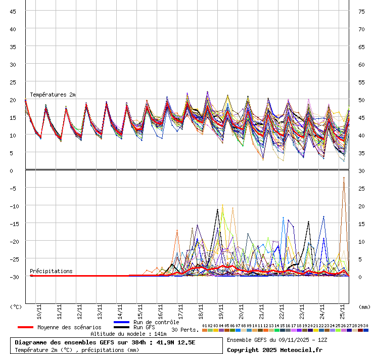 In queste mappe gli "spaghetti" generati dalla tecnica Ensemble per tutti i modelli matematici di cui si dispongono i dati, su località di vostra scelta. La tecnica Ensemble consiste nell'effettuare più corse (più quella di controllo) modificando di poco e opportunamente le condizioni iniziali inserite nei modelli stessi per verificare variazioni e affidabilità nell'evoluzione prevista. Laddove le soluzioni tendono ad "addensarsi" la prognosi sarà più probabile.