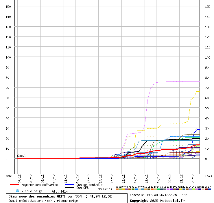 In queste mappe gli "spaghetti" generati dalla tecnica Ensemble per tutti i modelli matematici di cui si dispongono i dati, su località di vostra scelta. La tecnica Ensemble consiste nell'effettuare più corse (più quella di controllo) modificando di poco e opportunamente le condizioni iniziali inserite nei modelli stessi per verificare variazioni e affidabilità nell'evoluzione prevista. Laddove le soluzioni tendono ad "addensarsi" la prognosi sarà più probabile.