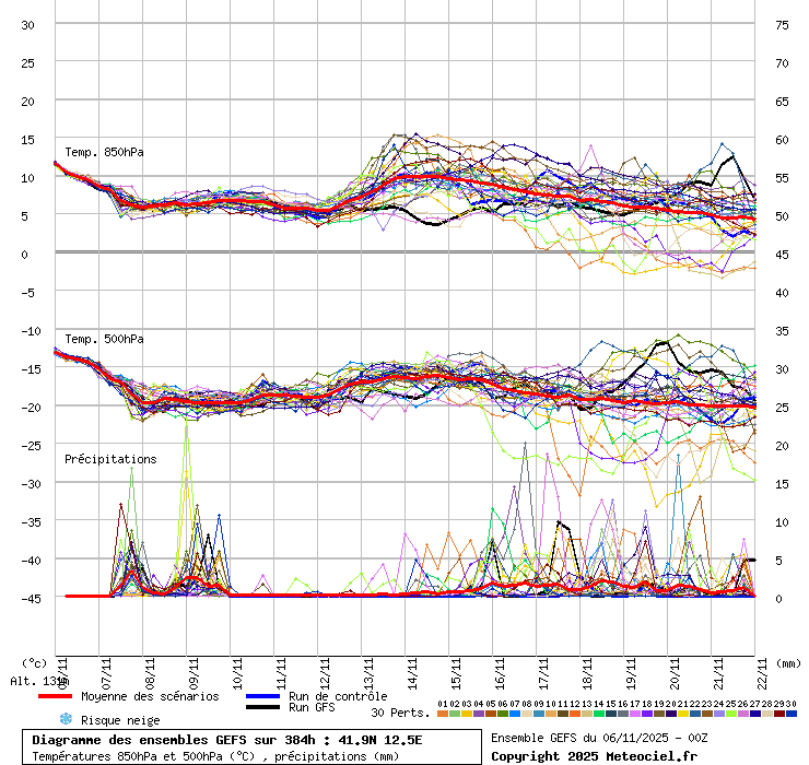 In queste mappe gli "spaghetti" generati dalla tecnica Ensemble per tutti i modelli matematici di cui si dispongono i dati, su località di vostra scelta. La tecnica Ensemble consiste nell'effettuare più corse (più quella di controllo) modificando di poco e opportunamente le condizioni iniziali inserite nei modelli stessi per verificare variazioni e affidabilità nell'evoluzione prevista. Laddove le soluzioni tendono ad "addensarsi" la prognosi sarà più probabile.