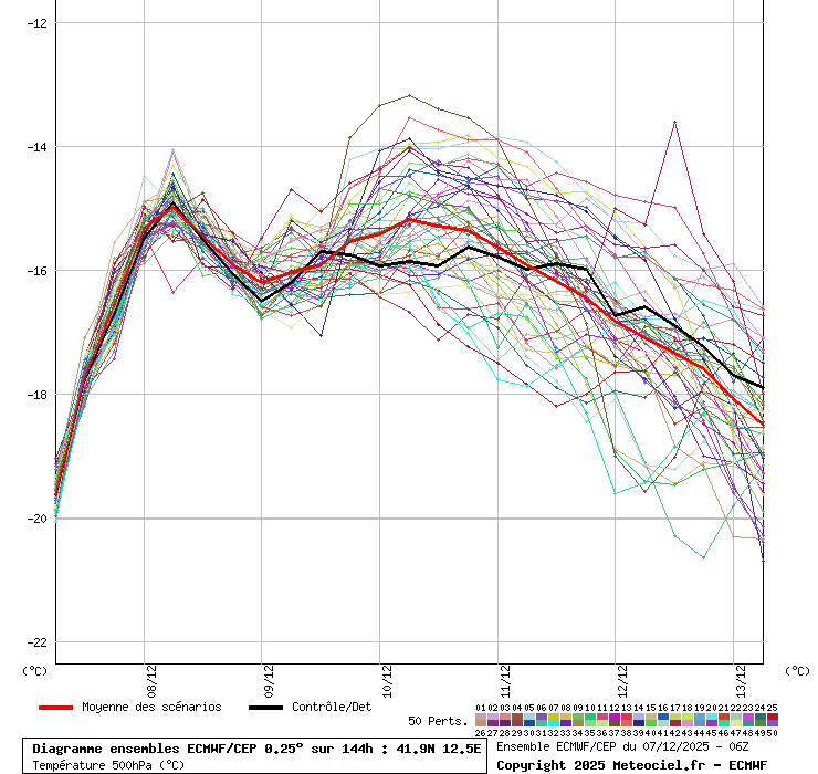 In queste mappe gli "spaghetti" generati dalla tecnica Ensemble per tutti i modelli matematici di cui si dispongono i dati, su località di vostra scelta. La tecnica Ensemble consiste nell'effettuare più corse (più quella di controllo) modificando di poco e opportunamente le condizioni iniziali inserite nei modelli stessi per verificare variazioni e affidabilità nell'evoluzione prevista. Laddove le soluzioni tendono ad "addensarsi" la prognosi sarà più probabile.