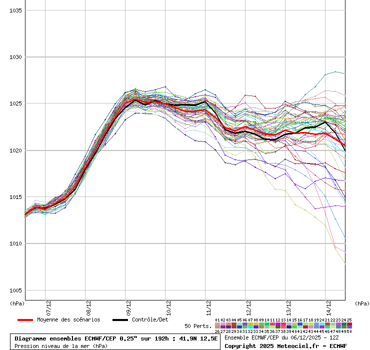 In queste mappe gli "spaghetti" generati dalla tecnica Ensemble per tutti i modelli matematici di cui si dispongono i dati, su località di vostra scelta. La tecnica Ensemble consiste nell'effettuare più corse (più quella di controllo) modificando di poco e opportunamente le condizioni iniziali inserite nei modelli stessi per verificare variazioni e affidabilità nell'evoluzione prevista. Laddove le soluzioni tendono ad "addensarsi" la prognosi sarà più probabile.