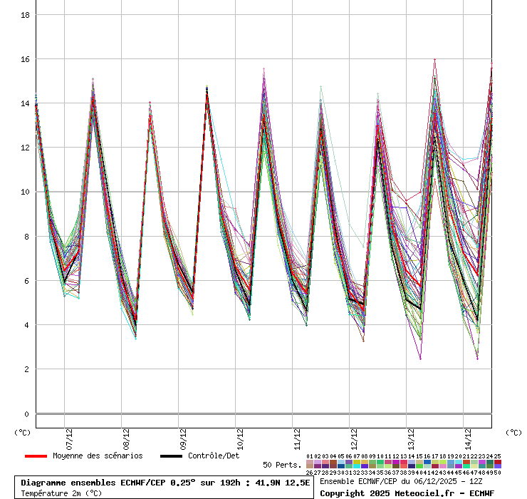 In queste mappe gli "spaghetti" generati dalla tecnica Ensemble per tutti i modelli matematici di cui si dispongono i dati, su località di vostra scelta. La tecnica Ensemble consiste nell'effettuare più corse (più quella di controllo) modificando di poco e opportunamente le condizioni iniziali inserite nei modelli stessi per verificare variazioni e affidabilità nell'evoluzione prevista. Laddove le soluzioni tendono ad "addensarsi" la prognosi sarà più probabile.