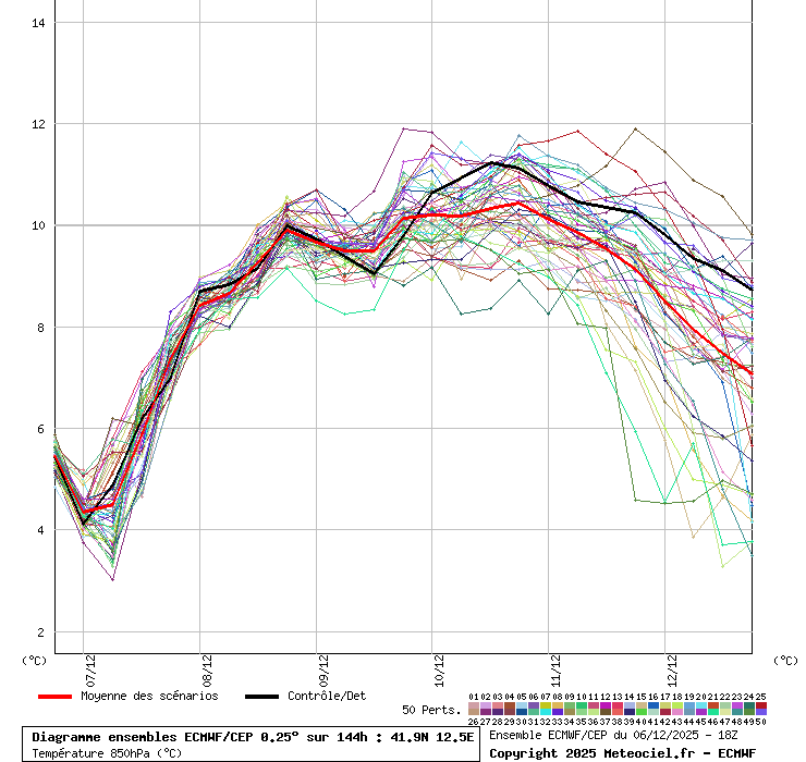 In queste mappe gli "spaghetti" generati dalla tecnica Ensemble per tutti i modelli matematici di cui si dispongono i dati, su località di vostra scelta. La tecnica Ensemble consiste nell'effettuare più corse (più quella di controllo) modificando di poco e opportunamente le condizioni iniziali inserite nei modelli stessi per verificare variazioni e affidabilità nell'evoluzione prevista. Laddove le soluzioni tendono ad "addensarsi" la prognosi sarà più probabile.