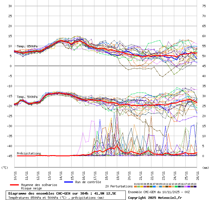 In queste mappe gli "spaghetti" generati dalla tecnica Ensemble per tutti i modelli matematici di cui si dispongono i dati, su località di vostra scelta. La tecnica Ensemble consiste nell'effettuare più corse (più quella di controllo) modificando di poco e opportunamente le condizioni iniziali inserite nei modelli stessi per verificare variazioni e affidabilità nell'evoluzione prevista. Laddove le soluzioni tendono ad "addensarsi" la prognosi sarà più probabile.