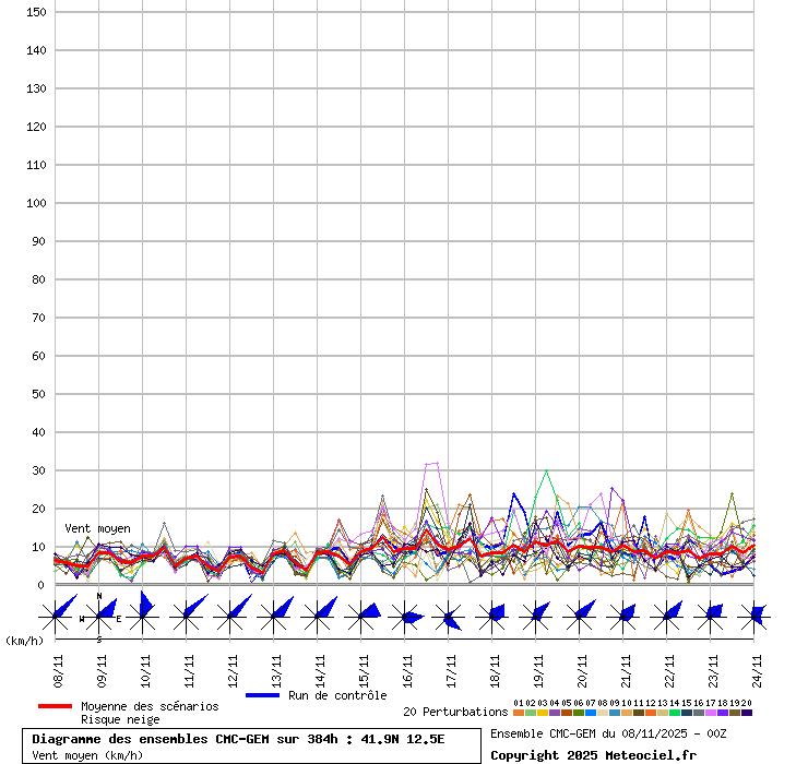 In queste mappe gli "spaghetti" generati dalla tecnica Ensemble per tutti i modelli matematici di cui si dispongono i dati, su località di vostra scelta. La tecnica Ensemble consiste nell'effettuare più corse (più quella di controllo) modificando di poco e opportunamente le condizioni iniziali inserite nei modelli stessi per verificare variazioni e affidabilità nell'evoluzione prevista. Laddove le soluzioni tendono ad "addensarsi" la prognosi sarà più probabile.
