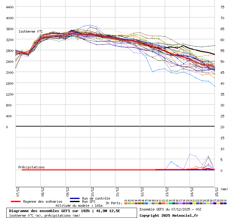 In queste mappe gli "spaghetti" generati dalla tecnica Ensemble per tutti i modelli matematici di cui si dispongono i dati, su località di vostra scelta. La tecnica Ensemble consiste nell'effettuare più corse (più quella di controllo) modificando di poco e opportunamente le condizioni iniziali inserite nei modelli stessi per verificare variazioni e affidabilità nell'evoluzione prevista. Laddove le soluzioni tendono ad "addensarsi" la prognosi sarà più probabile.