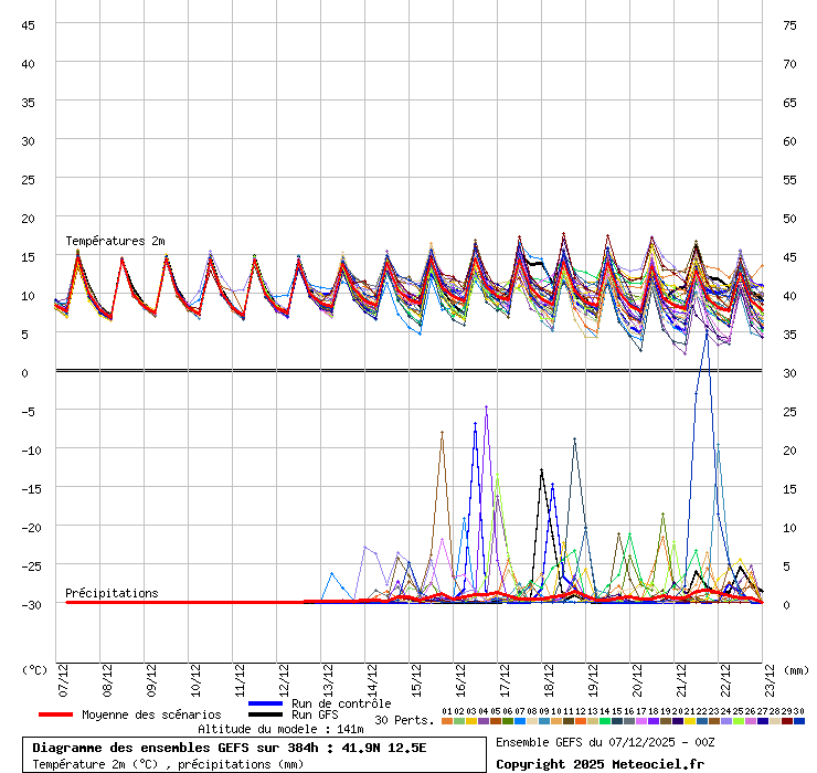 In queste mappe gli "spaghetti" generati dalla tecnica Ensemble per tutti i modelli matematici di cui si dispongono i dati, su località di vostra scelta. La tecnica Ensemble consiste nell'effettuare più corse (più quella di controllo) modificando di poco e opportunamente le condizioni iniziali inserite nei modelli stessi per verificare variazioni e affidabilità nell'evoluzione prevista. Laddove le soluzioni tendono ad "addensarsi" la prognosi sarà più probabile.