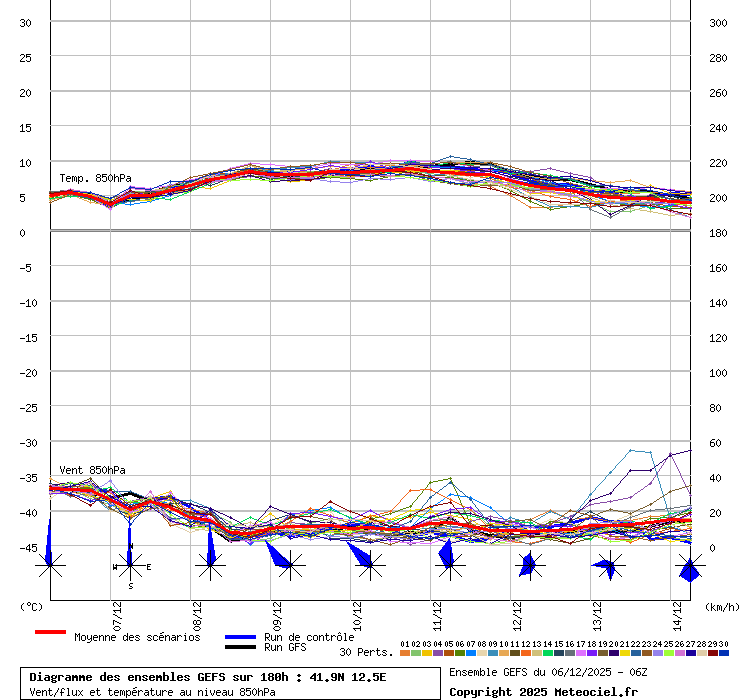 In queste mappe gli "spaghetti" generati dalla tecnica Ensemble per tutti i modelli matematici di cui si dispongono i dati, su località di vostra scelta. La tecnica Ensemble consiste nell'effettuare più corse (più quella di controllo) modificando di poco e opportunamente le condizioni iniziali inserite nei modelli stessi per verificare variazioni e affidabilità nell'evoluzione prevista. Laddove le soluzioni tendono ad "addensarsi" la prognosi sarà più probabile.