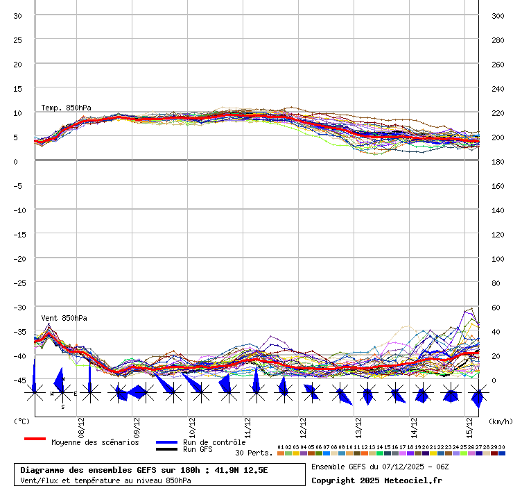 In queste mappe gli "spaghetti" generati dalla tecnica Ensemble per tutti i modelli matematici di cui si dispongono i dati, su località di vostra scelta. La tecnica Ensemble consiste nell'effettuare più corse (più quella di controllo) modificando di poco e opportunamente le condizioni iniziali inserite nei modelli stessi per verificare variazioni e affidabilità nell'evoluzione prevista. Laddove le soluzioni tendono ad "addensarsi" la prognosi sarà più probabile.