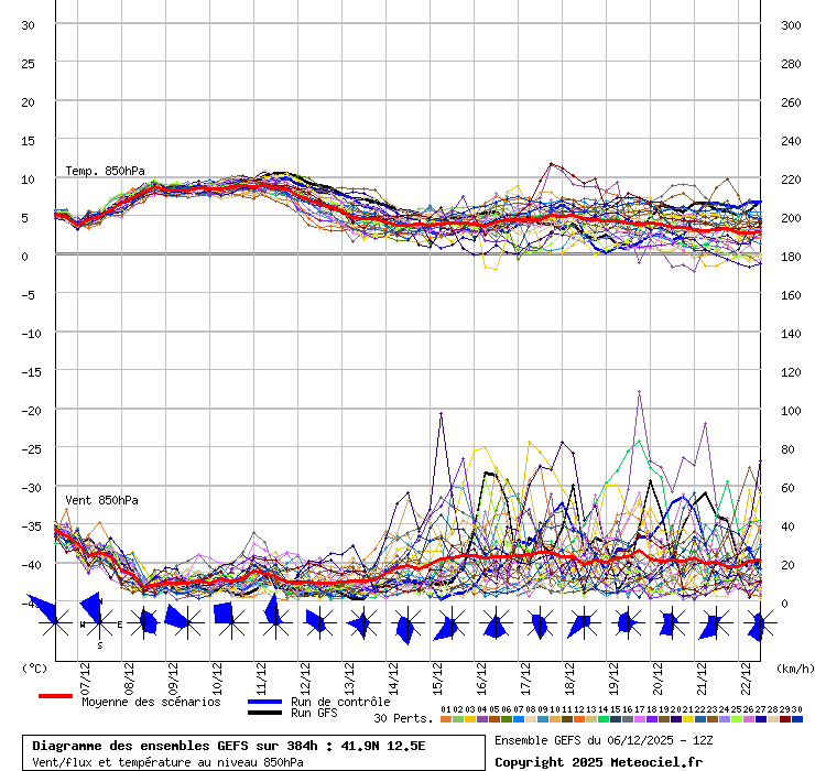 In queste mappe gli "spaghetti" generati dalla tecnica Ensemble per tutti i modelli matematici di cui si dispongono i dati, su località di vostra scelta. La tecnica Ensemble consiste nell'effettuare più corse (più quella di controllo) modificando di poco e opportunamente le condizioni iniziali inserite nei modelli stessi per verificare variazioni e affidabilità nell'evoluzione prevista. Laddove le soluzioni tendono ad "addensarsi" la prognosi sarà più probabile.