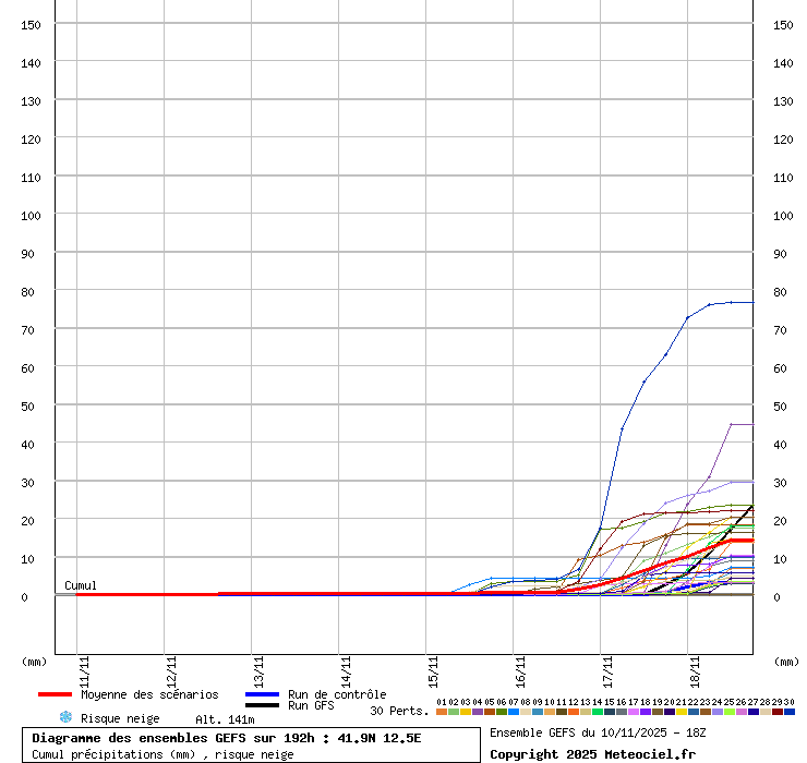 In queste mappe gli "spaghetti" generati dalla tecnica Ensemble per tutti i modelli matematici di cui si dispongono i dati, su località di vostra scelta. La tecnica Ensemble consiste nell'effettuare più corse (più quella di controllo) modificando di poco e opportunamente le condizioni iniziali inserite nei modelli stessi per verificare variazioni e affidabilità nell'evoluzione prevista. Laddove le soluzioni tendono ad "addensarsi" la prognosi sarà più probabile.