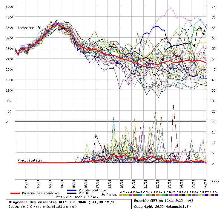 In queste mappe gli "spaghetti" generati dalla tecnica Ensemble per tutti i modelli matematici di cui si dispongono i dati, su località di vostra scelta. La tecnica Ensemble consiste nell'effettuare più corse (più quella di controllo) modificando di poco e opportunamente le condizioni iniziali inserite nei modelli stessi per verificare variazioni e affidabilità nell'evoluzione prevista. Laddove le soluzioni tendono ad "addensarsi" la prognosi sarà più probabile.