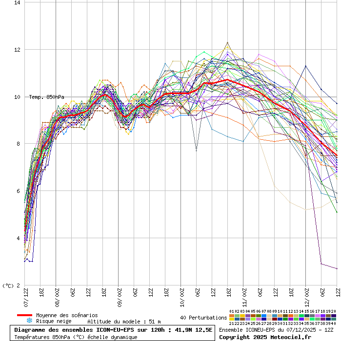 In queste mappe gli "spaghetti" generati dalla tecnica Ensemble per tutti i modelli matematici di cui si dispongono i dati, su località di vostra scelta. La tecnica Ensemble consiste nell'effettuare più corse (più quella di controllo) modificando di poco e opportunamente le condizioni iniziali inserite nei modelli stessi per verificare variazioni e affidabilità nell'evoluzione prevista. Laddove le soluzioni tendono ad "addensarsi" la prognosi sarà più probabile.