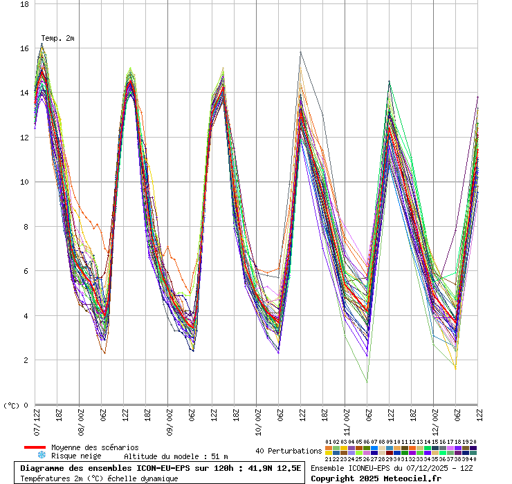 In queste mappe gli "spaghetti" generati dalla tecnica Ensemble per tutti i modelli matematici di cui si dispongono i dati, su località di vostra scelta. La tecnica Ensemble consiste nell'effettuare più corse (più quella di controllo) modificando di poco e opportunamente le condizioni iniziali inserite nei modelli stessi per verificare variazioni e affidabilità nell'evoluzione prevista. Laddove le soluzioni tendono ad "addensarsi" la prognosi sarà più probabile.